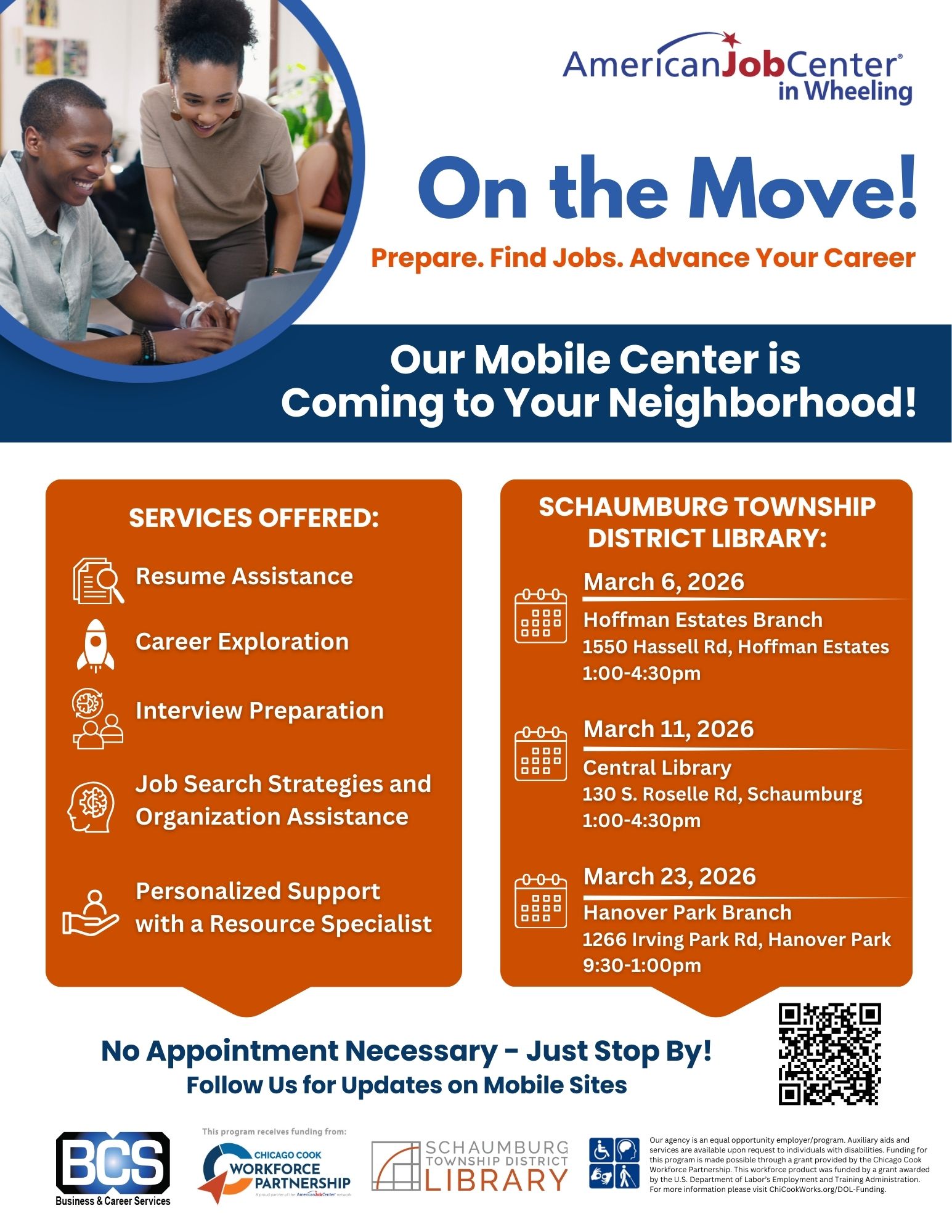 The American Job Center in Wheeling is on the move! Staff will be on-site offering free employment and career services. Stop by for free job search assistance, resume reviews, interview preparation, and access to employment and training resources. Open to all job seekers and NO appointment necessary. Location and Dates: Schaumburg Township District Library Locations: